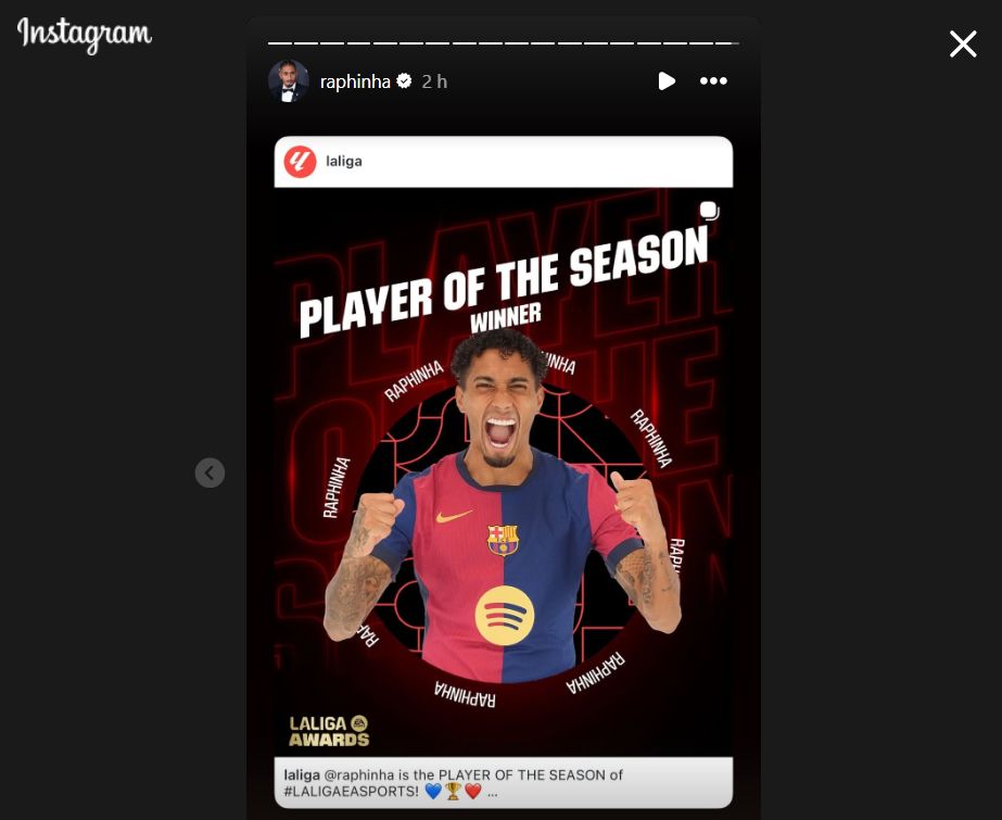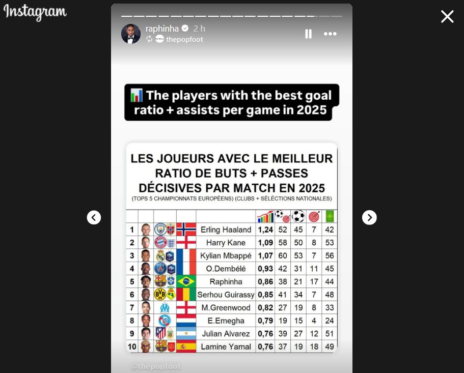 ردًا على استبعاده، نشر رافينيا، البالغ من العمر 28 عامًا، سلسلة من 18 صورة وفيديو على حسابه في إنستغرام، استعرض فيها إنجازاته خلال الموسم الماضي. تضمنت هذه المنشورات لقطات له وهو يرفع الألقاب، بالإضافة إلى حصوله على جائزة أفضل لاعب في الليغا. كما تصدر قائمة هدافي دوري أبطال أوروبا برصيد 13 هدفًا، وحقق إجمالي 62 هدفًا وصناعة في 64 مباراة، مما يعكس موسمًا استثنائيًا على مستوى الأداء والإحصائيات.