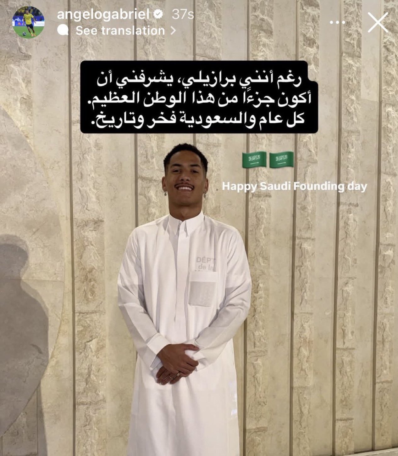 أعرب النجم البرازيلي أنجيلو غابرييل، لاعب نادي النصر، عن سعادته واعتزازه بالمشاركة في احتفالات يوم التأسيس السعودي، من خلال رسالة مؤثرة نشرها على حسابه الرسمي في “إنستغرام”.